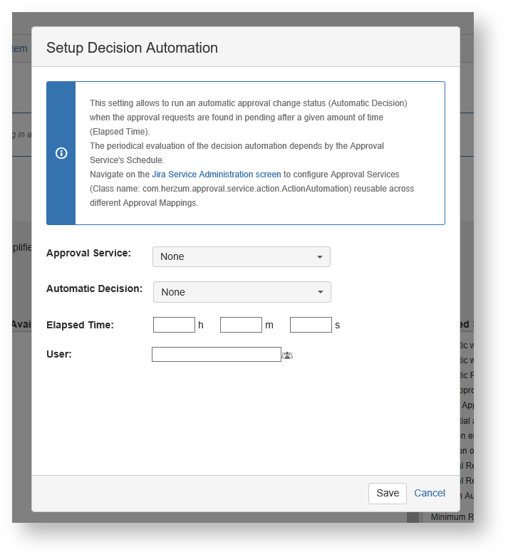 Select Decision Automation to allow an automatic approval change status (Automatic Decision) when the approval requests are found in pending after a given amount of time (Elapsed Time).