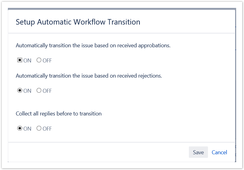 - the Automatic transitioning of the issue based on received rejections (by default All rejections)