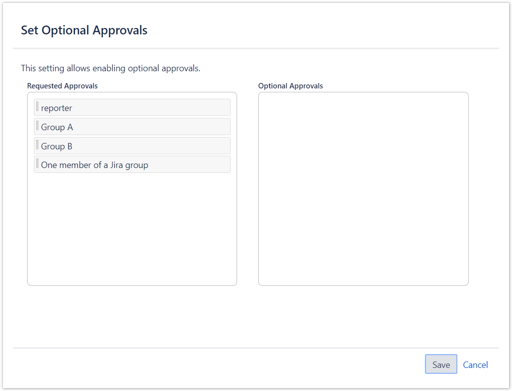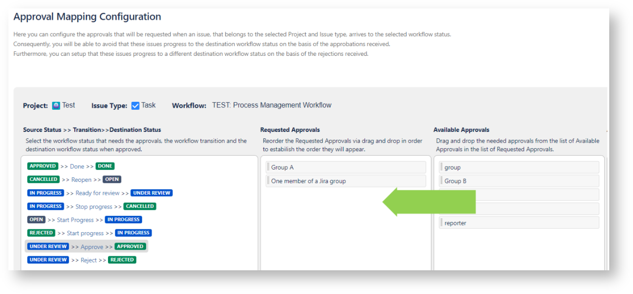 - Select a workflow transition and drag and drop the Available Approvals under the Requested Approvals column