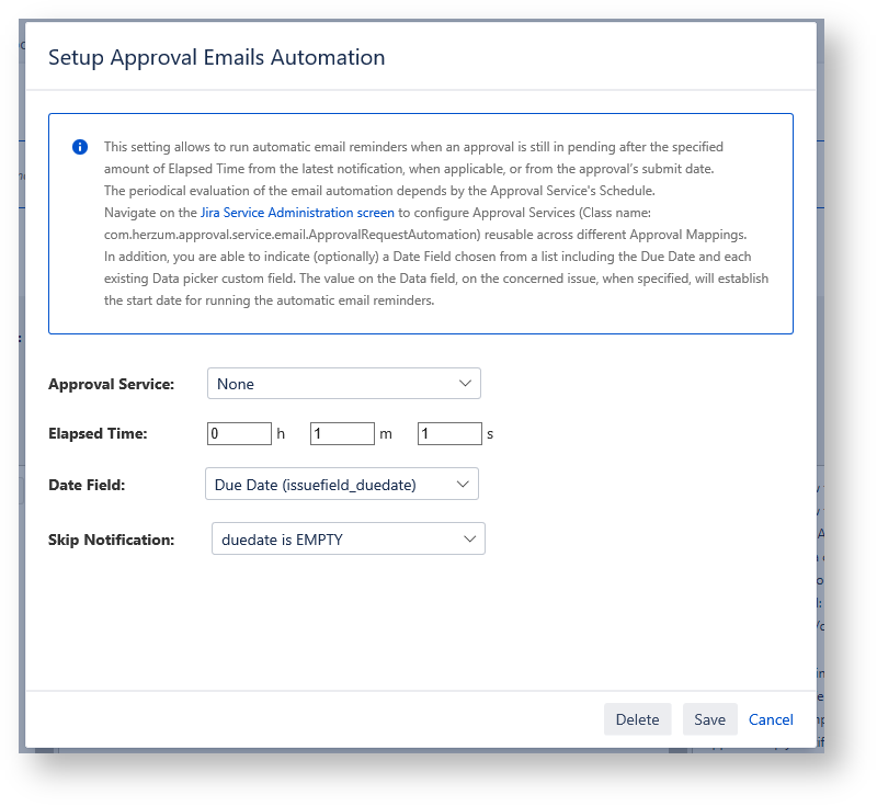 Navigate on the Jira Service Administration screen to configure Approval Services (Class name: com.herzum.approval.service.email.ApprovalRequestAutomation) reusable across different Approval Mappings.
