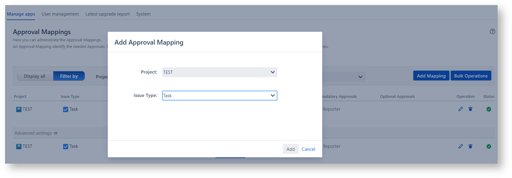 Follow the steps below to create new Approval Mappings per selected Project and Issue Type