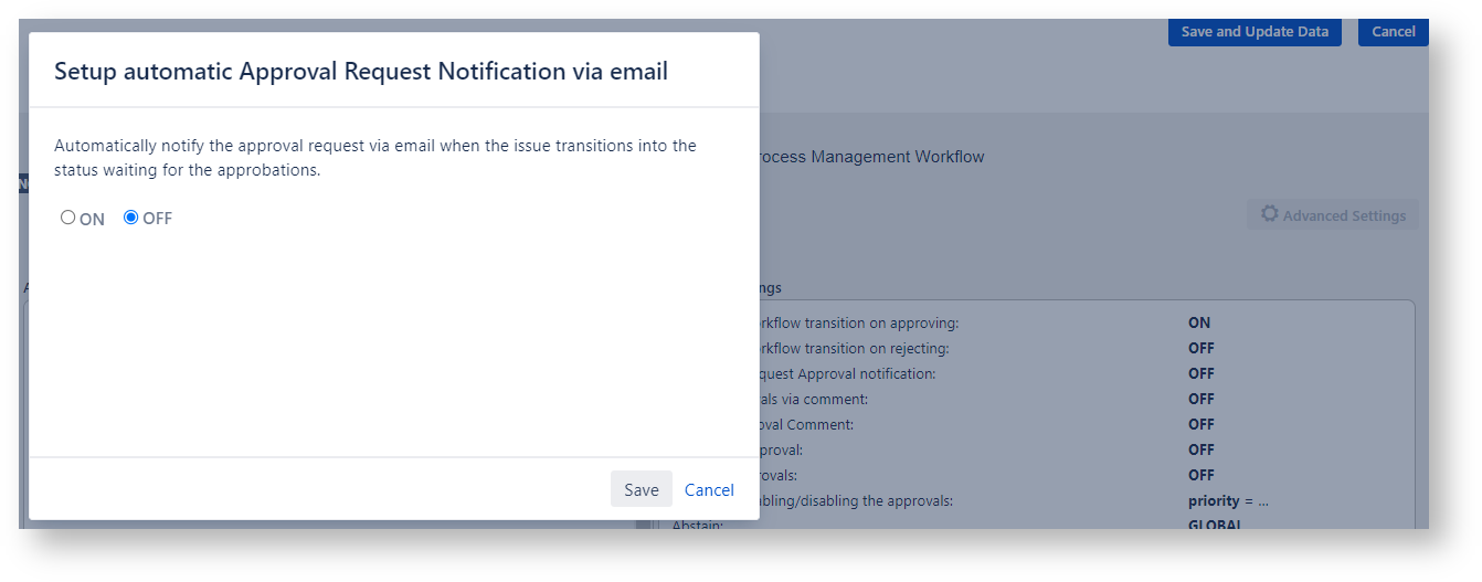 The Setup Automatic Approval Request notification screen allows to notify approvers automatically via email of a new pending approval request.