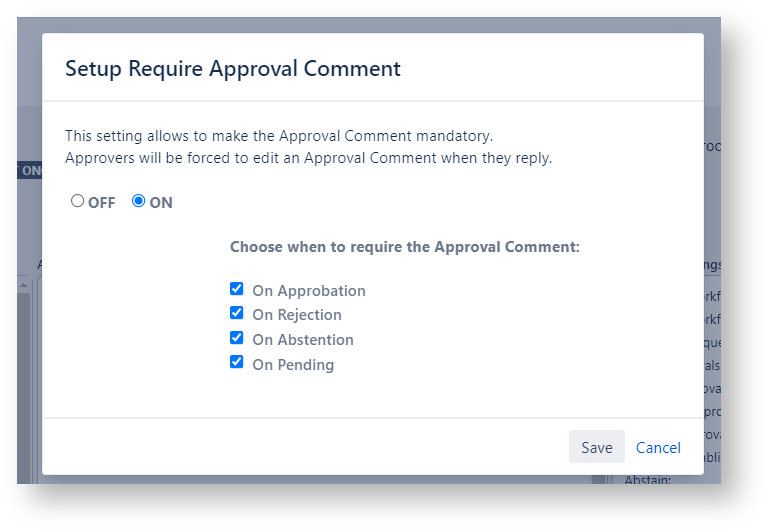 The Setup Require Approval Comment screen allows to require that the approver inserts an approval comment to justify the approval decision.