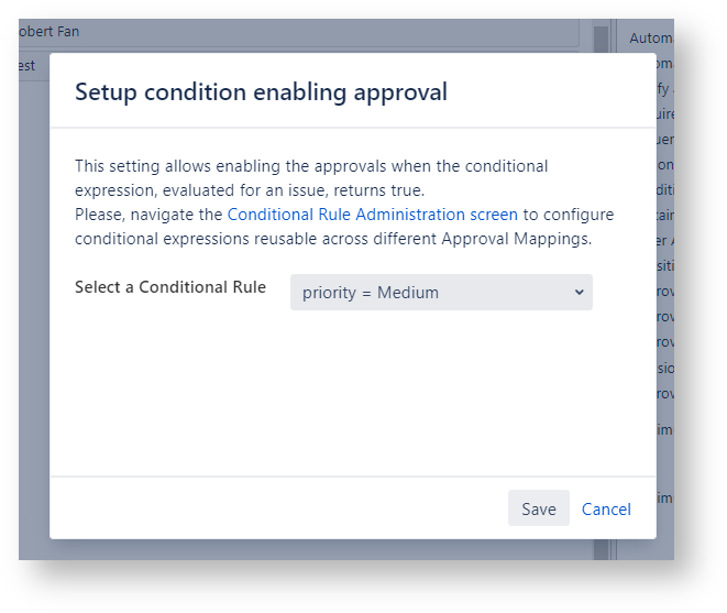 Select Condition enabling/disabling the approvals in order to enable the approvals when the Conditional Rule, evaluated on the issue, returns true.