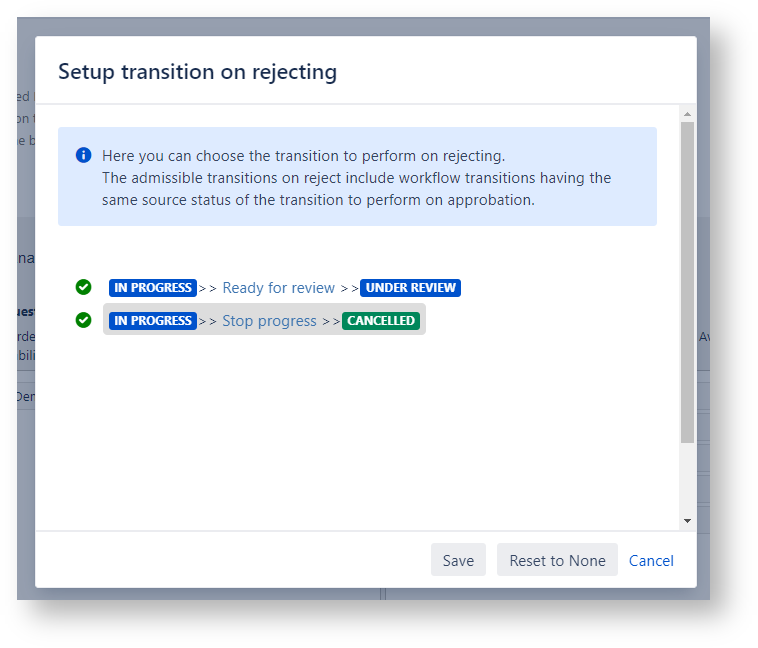 Select Transition on rejecting in order to select the transition to perform on rejecting.