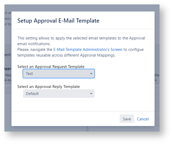 Select the E-Mail Templates option in order to to choose the email templates to apply when notifying the Approval Request and an Approval Reply emails.