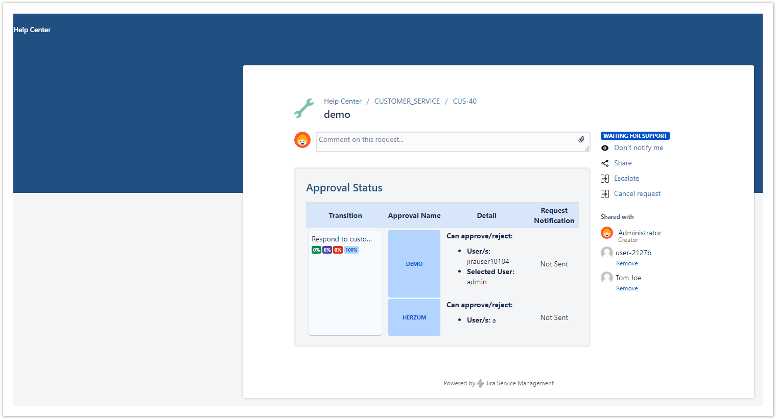 - the automatic notification via comments of the approval request when the issue moves in the selected source status