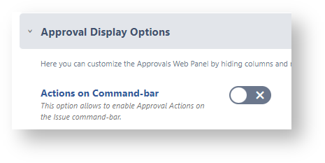 The Actions on the command-bar option allows you to enable the capability for users to perform the Approval actions on the command-bar of the issue.