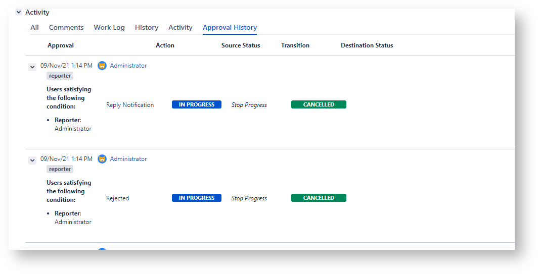 • enable the Approval History tab on the issue in order to display historical data relating the Approvals for the current issue