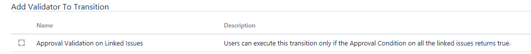 The Herzum Approval Validation on Linked Issues validator is a built-in validator that is able to block a workflow transition until all the Approval Conditions, on all the linked issues, returns true.