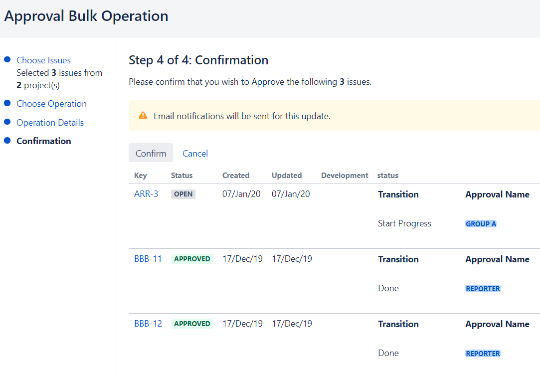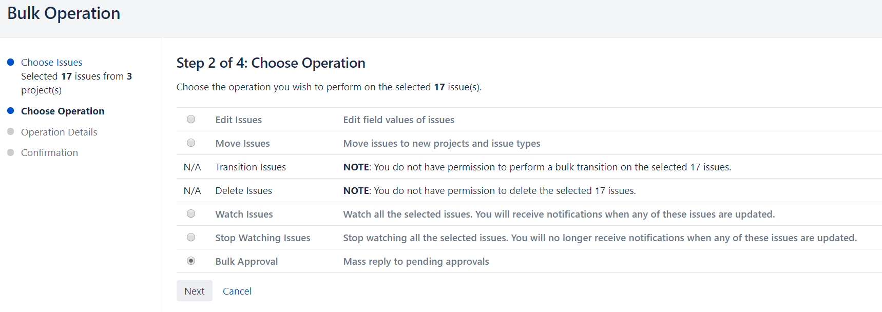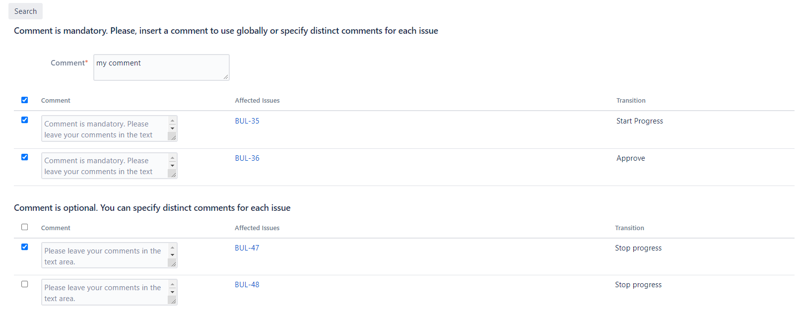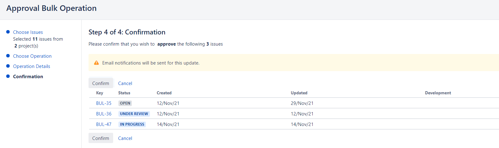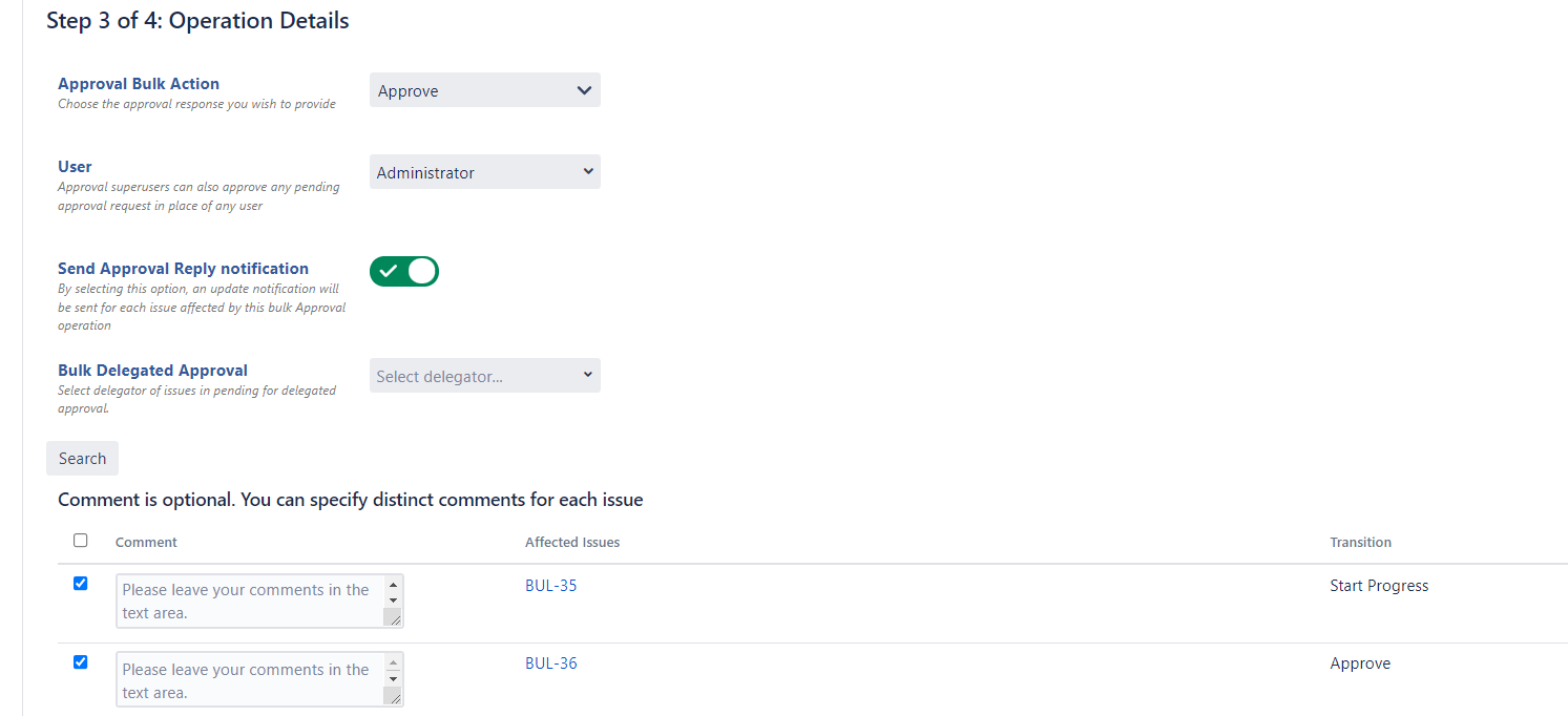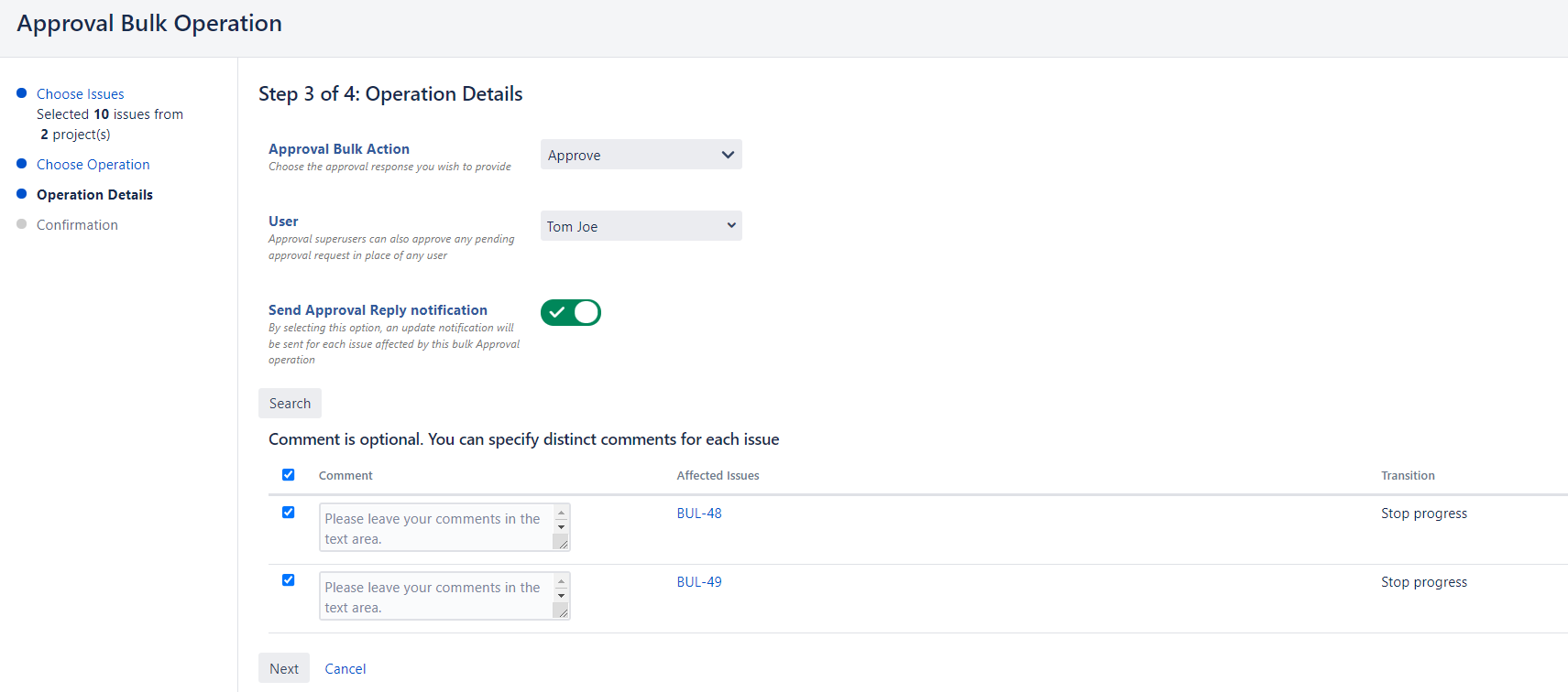 Add the Approval comment optionally and click Next or, if the Approval Comment is Required, it is mandatory to add it to proceed. You ca insert a comment to use globally or specify distinct comments for each issue.