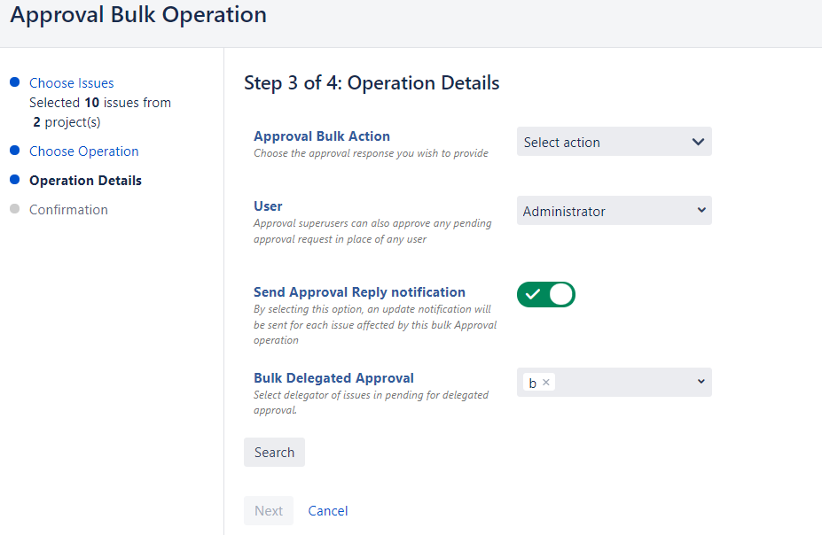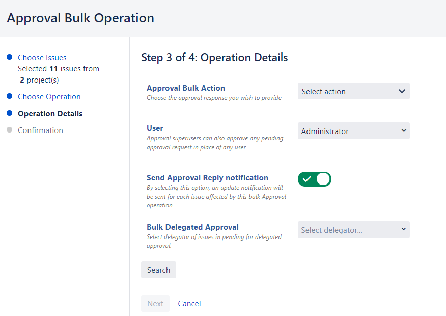 Leave the option SendApproval Reply notification On in order to send an email notifying the Approval action for any affected issue or turn it Off to skip the email notifications