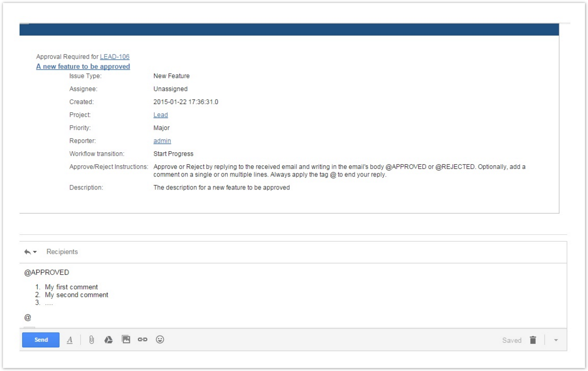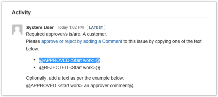 When the Approval Request has been notified via comment, the users having proper rights can approve or reject by adding a Jira comment.