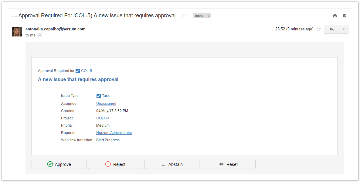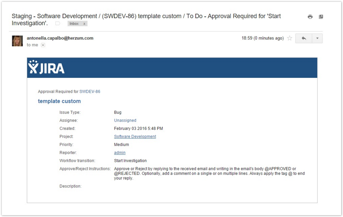 Users can express their approval decision via email, without logging into Jira.