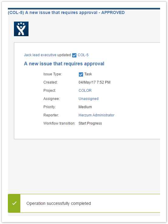 Refresh the issue in order to review the comment (automatically created by the app) confirming the approval action has been successfully performed.