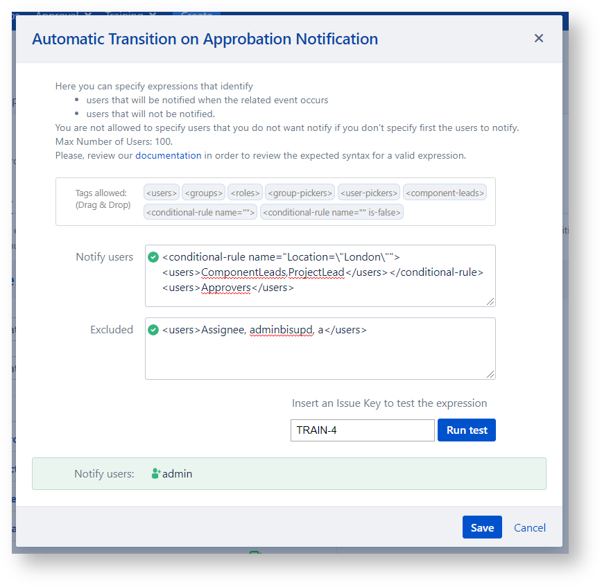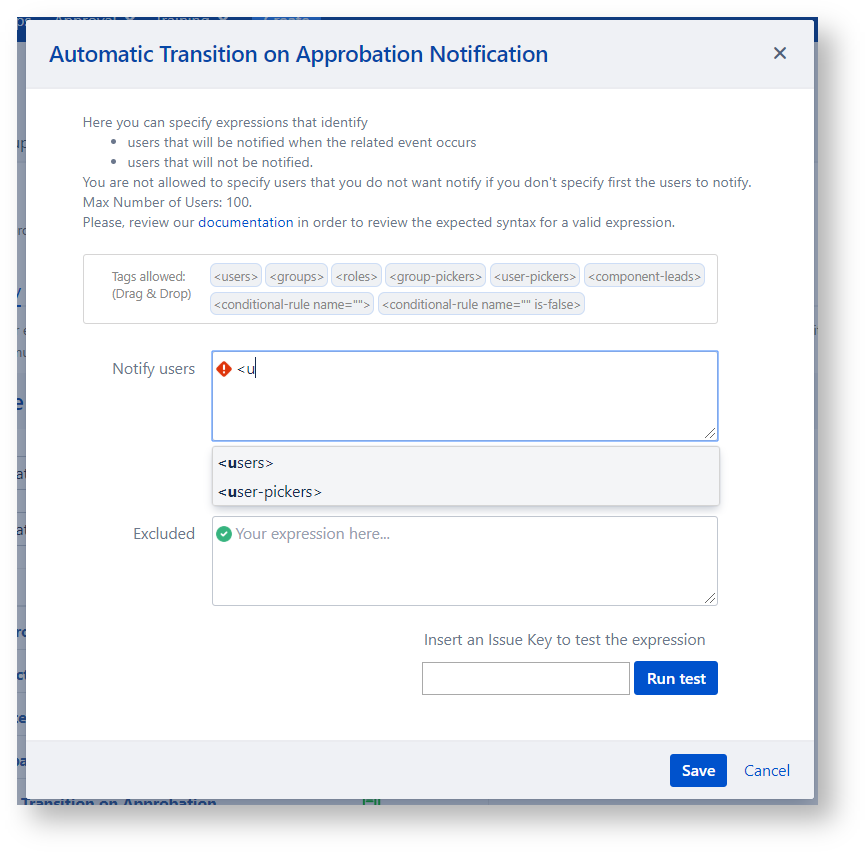In order to test your expressions, you can specify an issue key, click on Run Test and review the list of users that are returned.