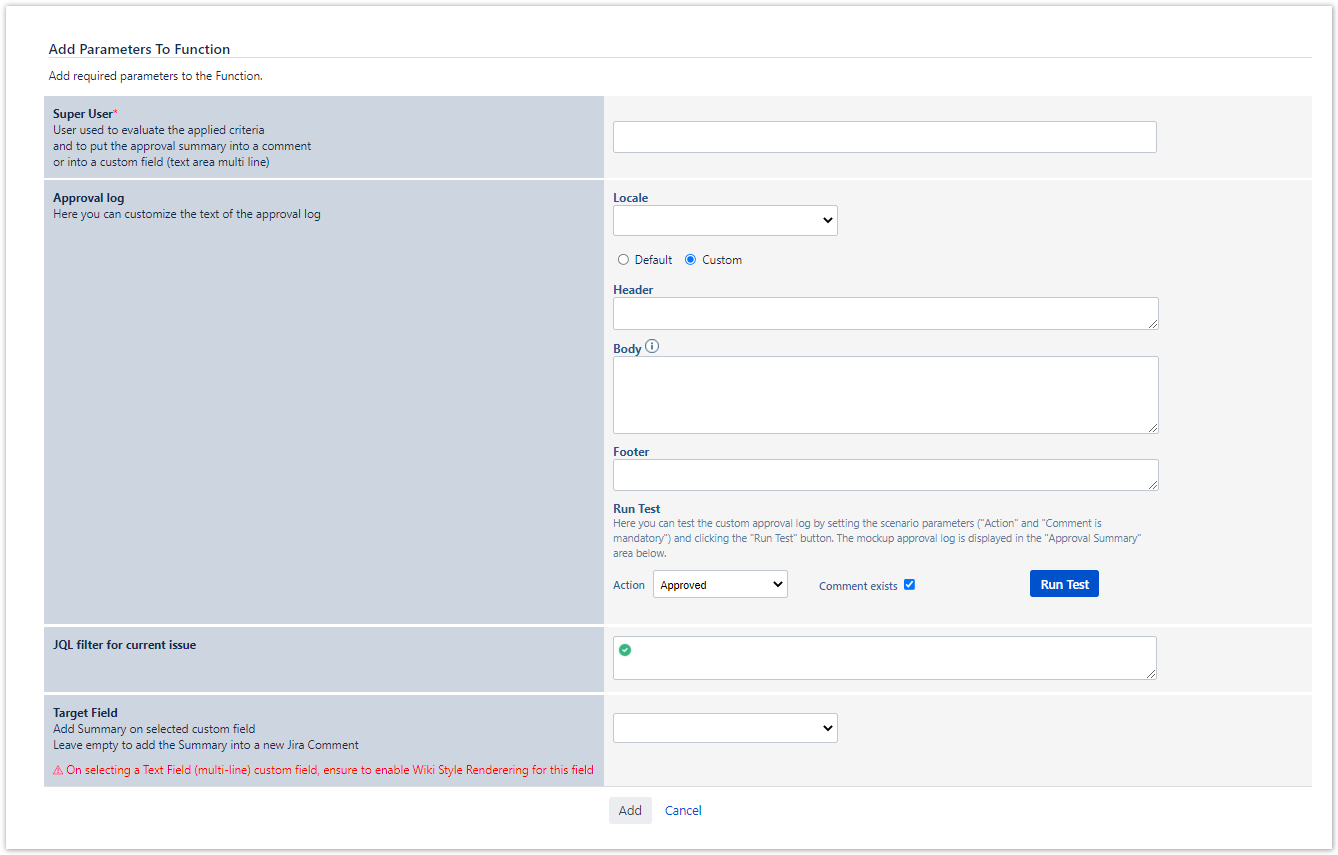 - Target Field - Add Summary on the selected custom field (Optional): When filled, the Approval Summary will be put on the selected custom field. Leave empty to add the Summary into a new Jira Comment on the current Issue.