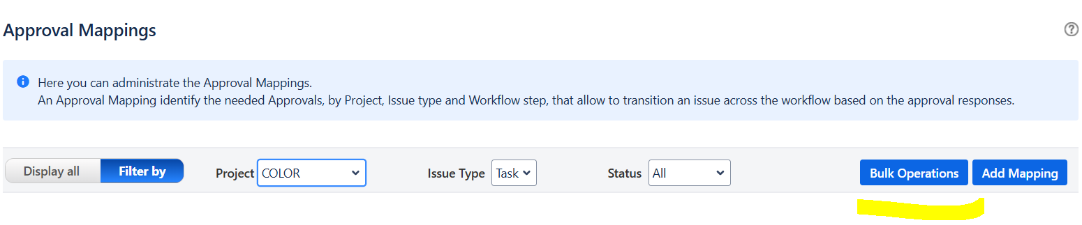 mappingList | Part of Action Request | List of (destination project ID, issuetype ID) IDs which identify the destination workflow whose approval mapping configuration is to be updated. | Mandatory |