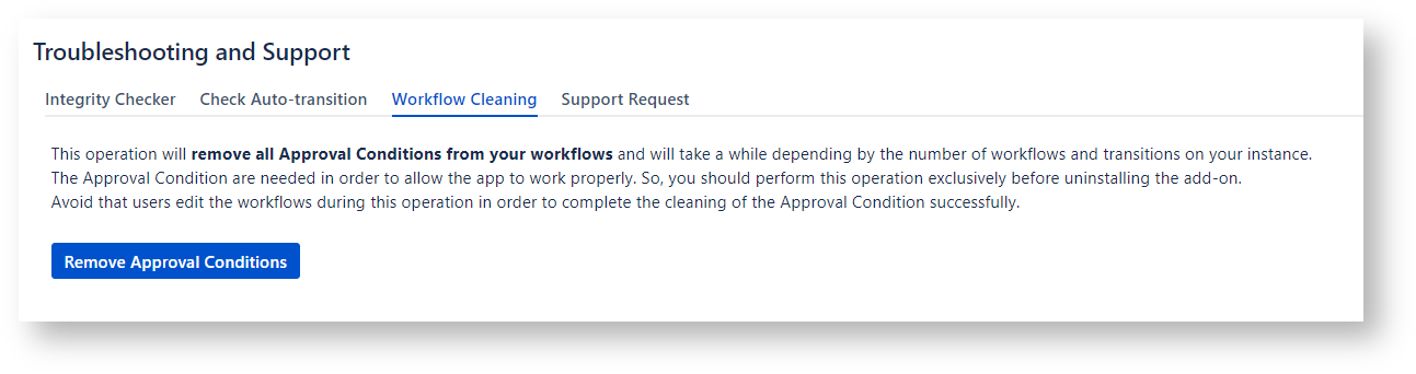Navigate the Workflow Cleaning tab on the Troubleshooting and Support screen and click Remove Approval Condition in order to remove all Approval conditions from all transitions of each workflow.