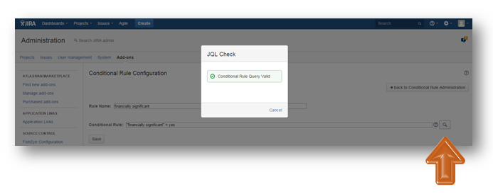 The Conditional rule expects a query using the JIRA Query Language (JQL) sintax.