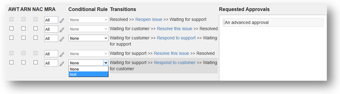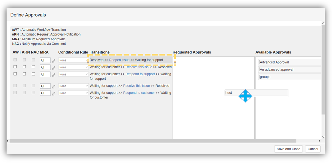 3 | Select a workflow transition, drag and drop all desired Approvals from the Available Approvals to the Requested Approvals column. You can remove an Approval by dragging it from the Requested Approvals to the Available Approvals column.