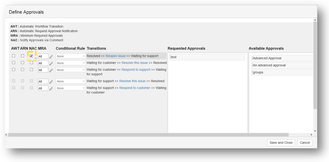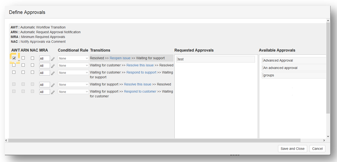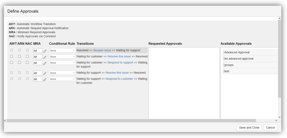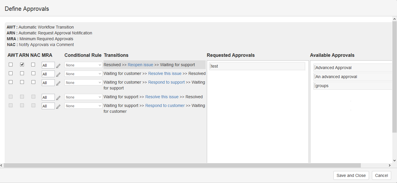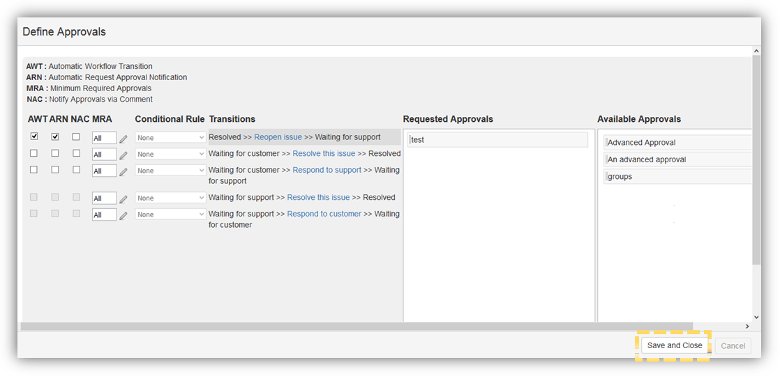 9 | Click on Save and Close. When updating one of the defined Required Approvals for a transition the 'Cancel' button is disabled and applied changes cannot be undone. |