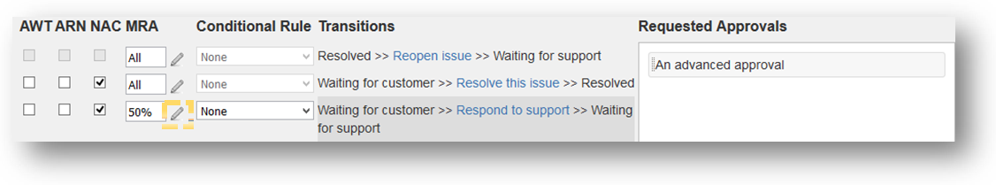 4 | Check AWT box to allow automatic workflow transitioning when all the required approval requests have been approved. This action is allowed if at least an approval has been configured toward the considered transition. | Define Approval screen - AWT check box |