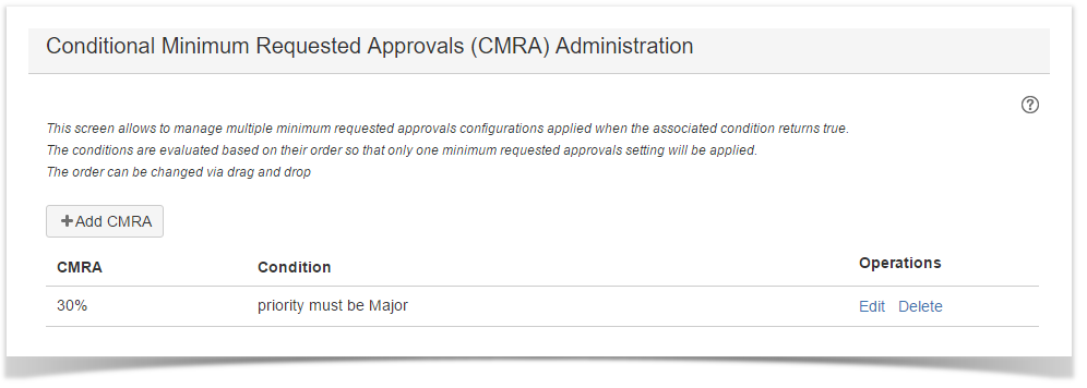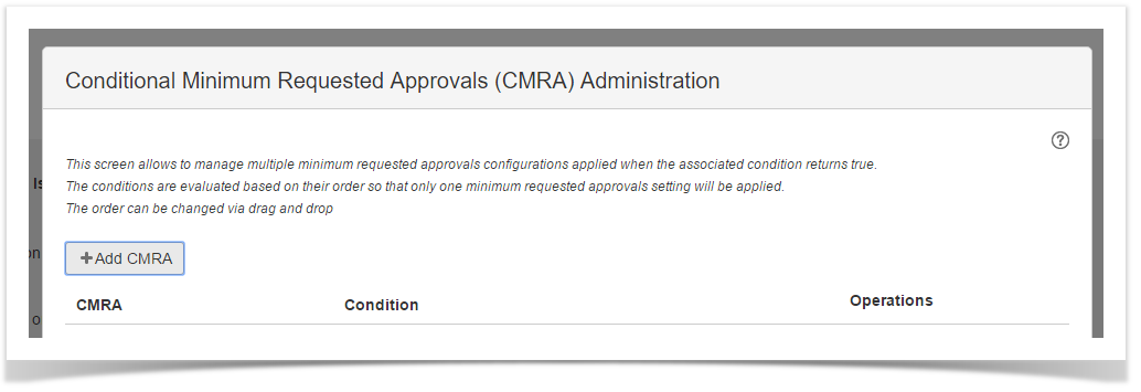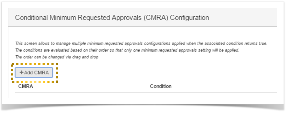 | 3 | Click Add CMRA to configure a new Conditional Minimum Requested Approvals (CMRA). | Conditional Minimum Requested Approvals (CMRA) Administration |