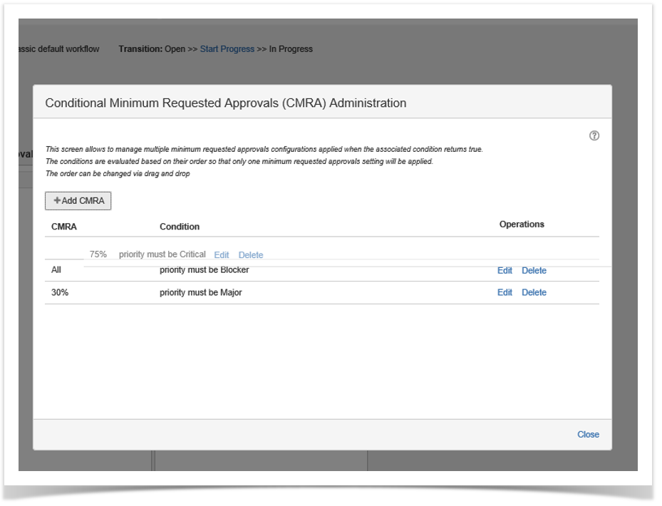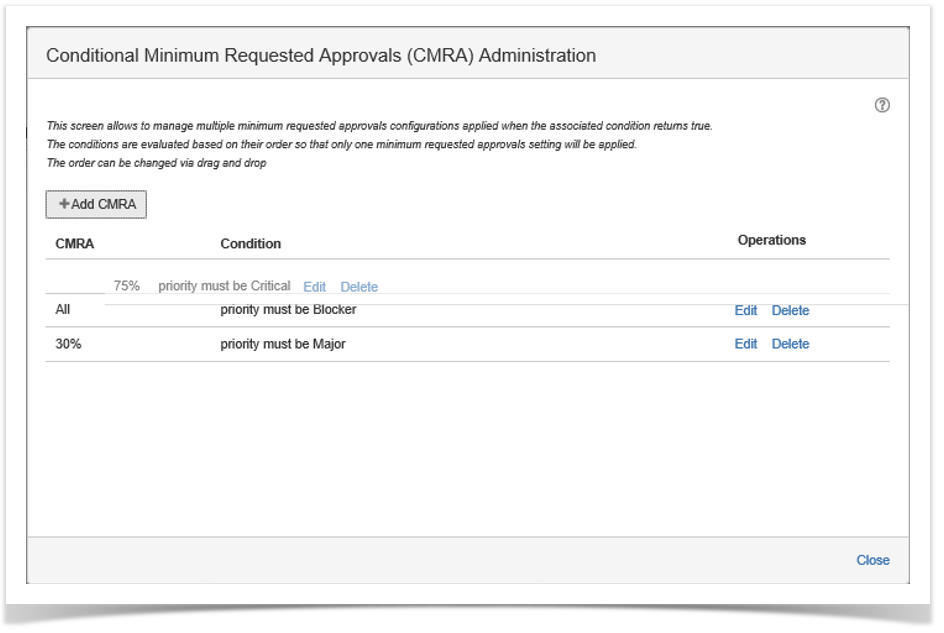 Similarly to the MRA, a CMRA allows to specify the minimum number of approvals allowing transition the issue also if not all the configured Approval requests have been approved and also if some of them have been rejected.