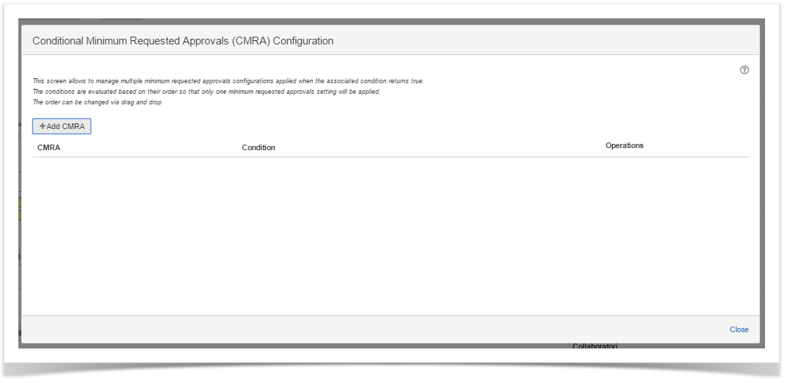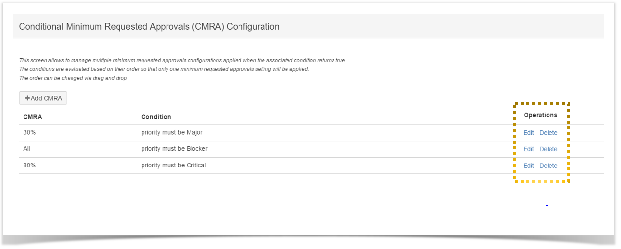 | 5 | Drag and drop a CMRA configuration to prioritize the relative order followed to evaluate these settings. The order is taken in consideration to evaluate the setting to apply when multiple conditions return true. | Conditional Minimum Requested Approvals (CMRA) Administration |