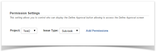 | 2 | Select the Project and the Issue type and click Add Permissions. | Define Approval Administration screen |