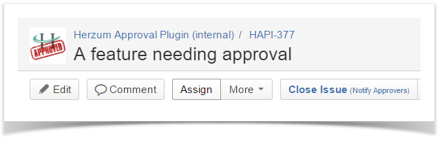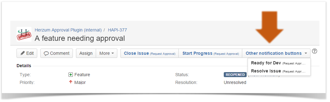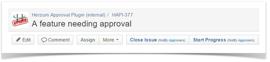 The issue screen shows one button for each workflow transition having been associated with one/more approval/s as showed below.