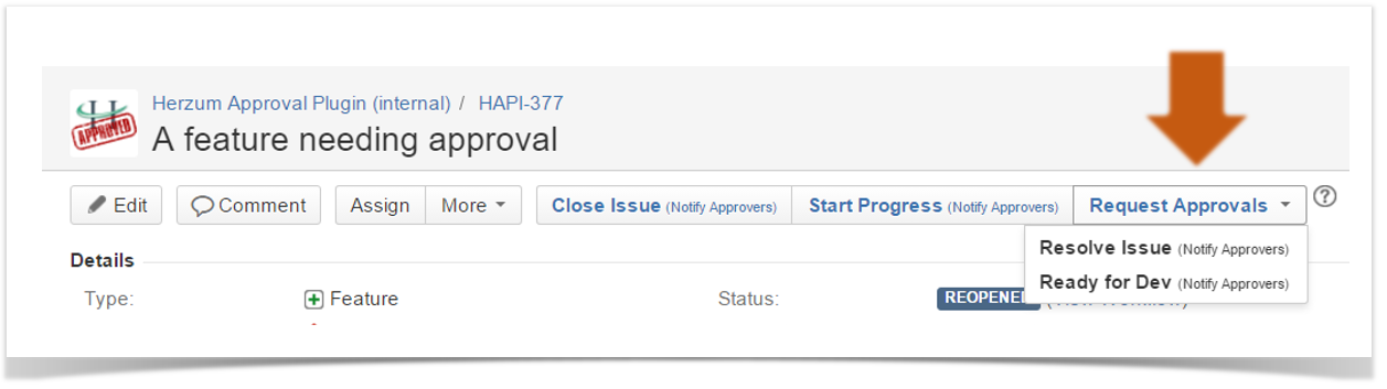 Following, first, you can review the screenshots of an issue displaying a not customized Request Approval button label and, then, an issue displaying a customized button together to the related settings .
