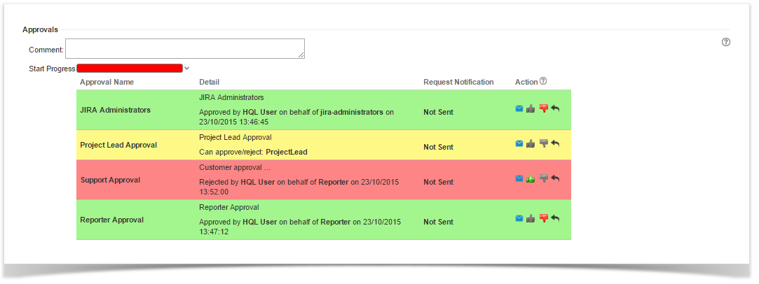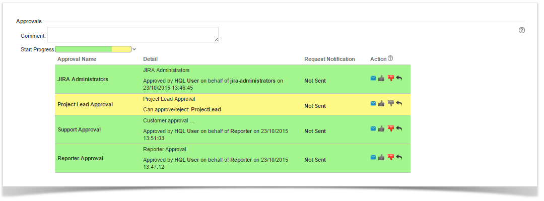 A progress bar show, in percentage, if the approval requests have been approved (green) or if they are in pending status (yellow).