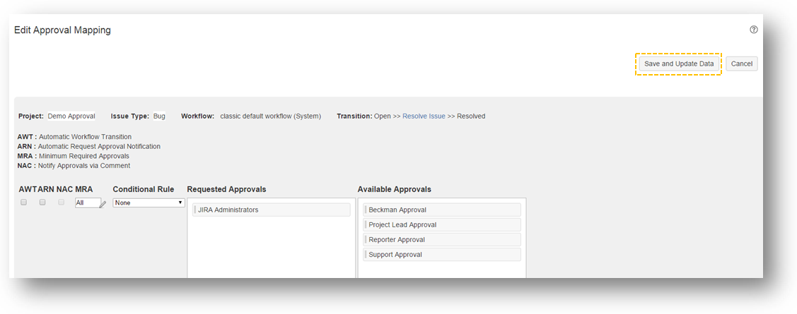 2 | Update any of the previously configured settings and click on Save and Update data. On updating one of the configured settings the changes become irreversible and the Cancel is disabled. The updated mapping will be applied on already existing issues too.