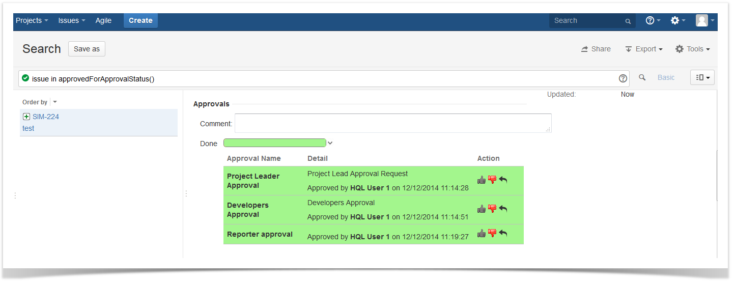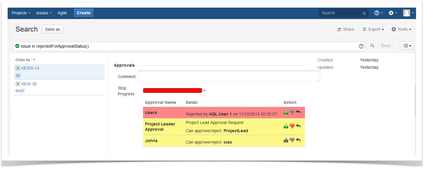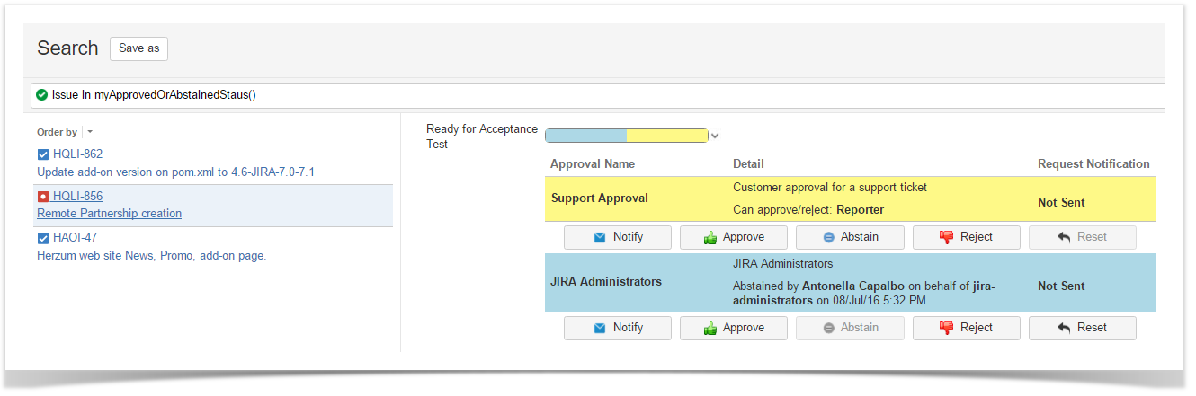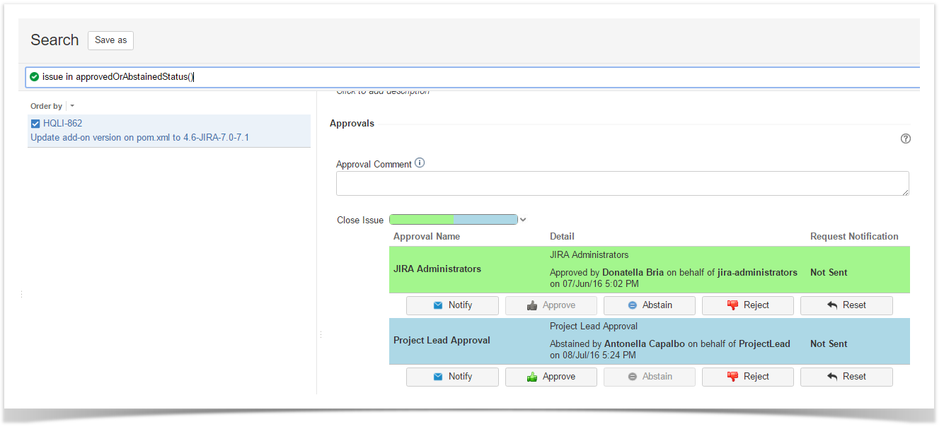 The Approval JQL functions can be combined with other functions as showed in the following screenshot.