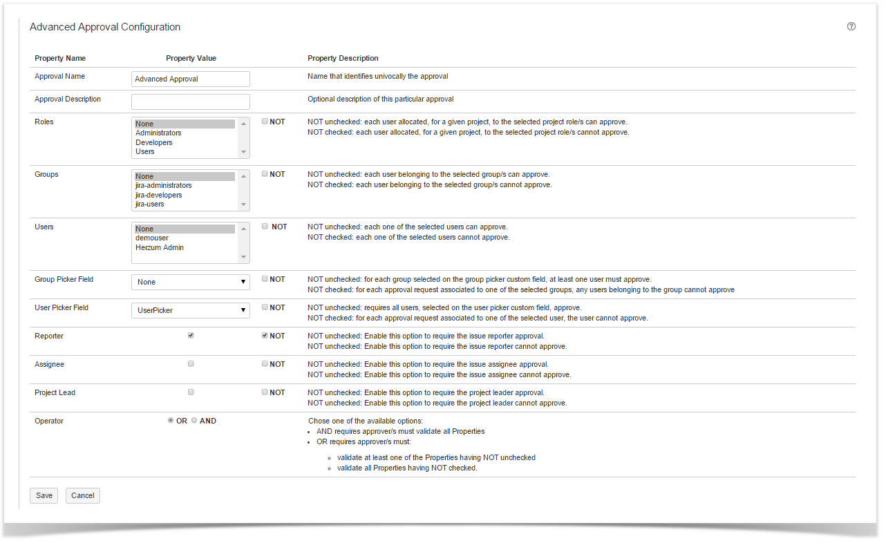 Same examples of Approvals set with User/Group picker custom fields can be reviewed on: Configuring an Approval via user and group picker custom fields | Approval Configuration screen |