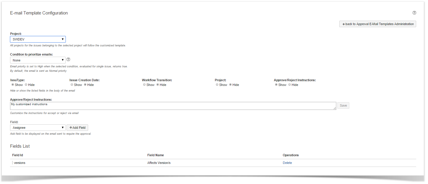 | 2 | Update the template by changing the Condition to Prioritize emails, hiding or showing Issue Type, Issue Creation Date, Project, Workfow transition, Approve/Reject Instructions , Editing the Approve/Reject Instructions, adding a new field or deleting an existing one. | E-Mail Template Configuration screen |