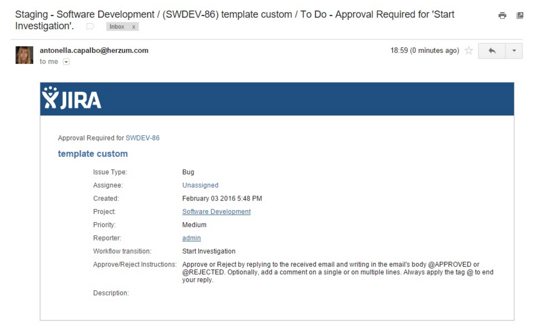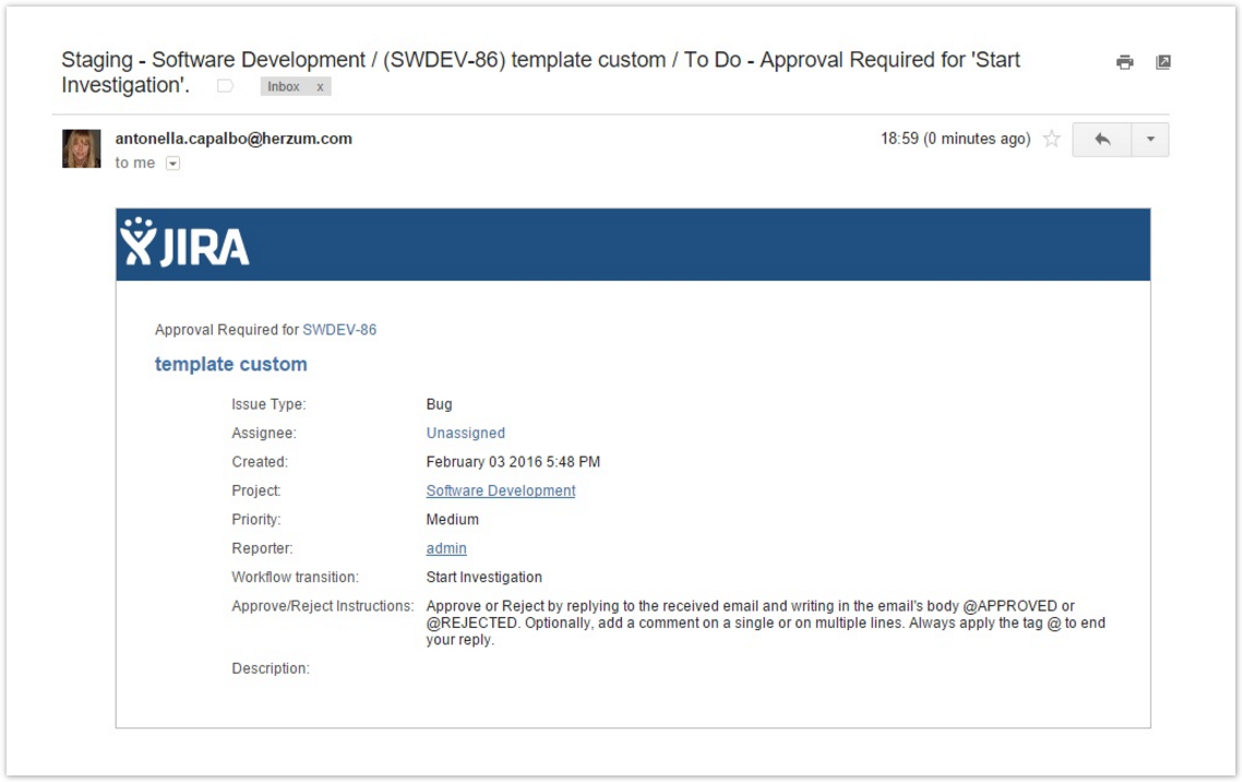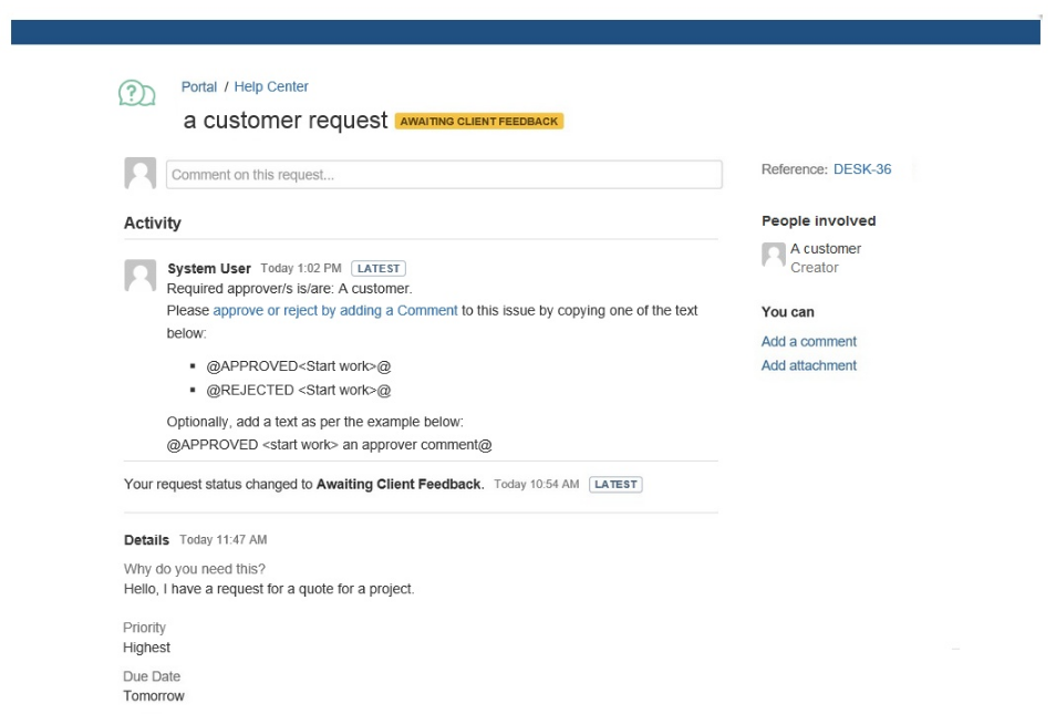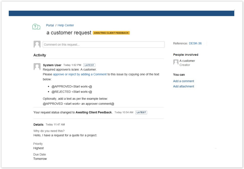 When enabling the advanced setting Notify approvals via comment, the approval request is notified via a Jira comment that shows up on Jira Service Desk customer portal too.