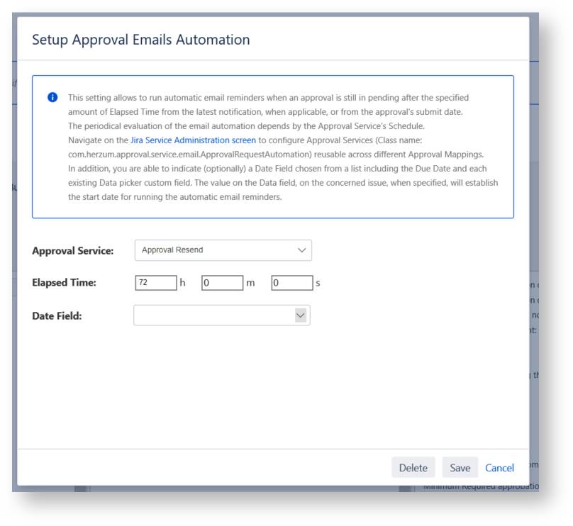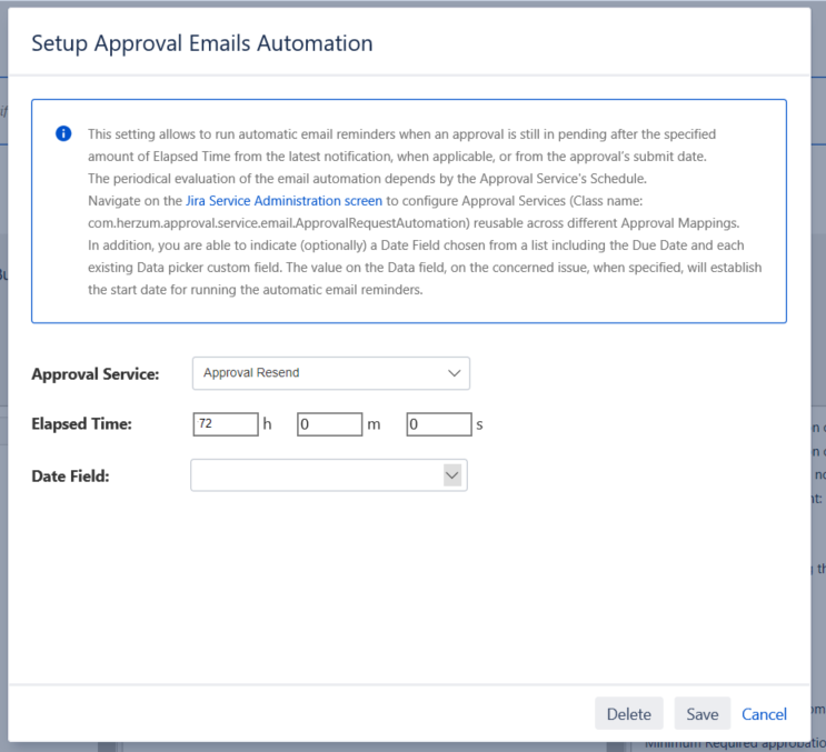 The Approval Request email Resend Automation is a configurable option of the Herzum Approval app that requires you register an Approval Request email Resend Automation Service and setup the Approval Emails Automation setting on the concerned Approval Mapping.