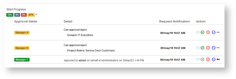The following screenshot shows two pending approvals (Manager A and Manager B) already notified 3 days ago.