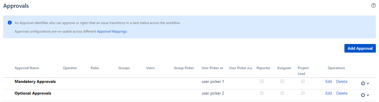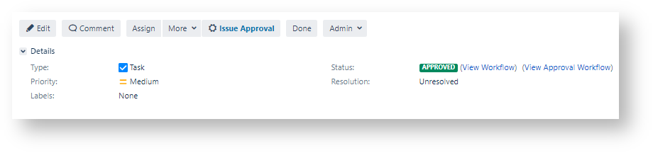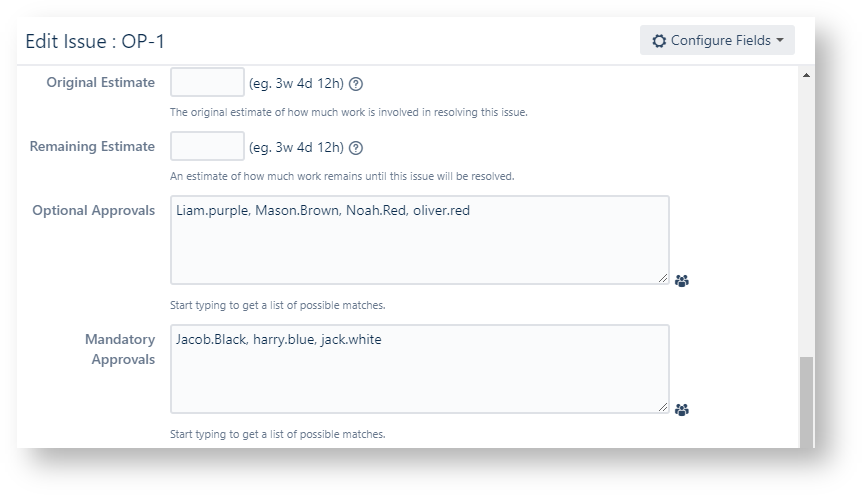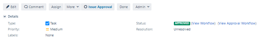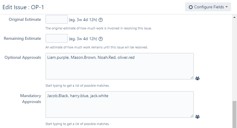 Create a new issue that requires the approval of a set of users kept in the Approvers Mandatory user picker custom field and, optionally, the approval of a second set of users kept in the Approvers Optional user picker custom field.