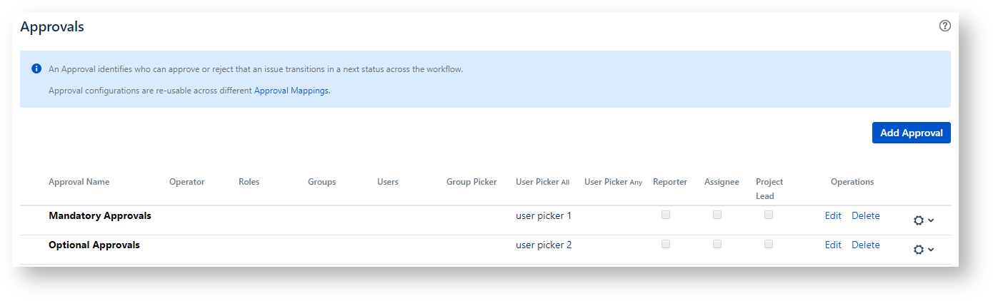 - The two Approval configurations will show on the Approval Administration screen as follows.