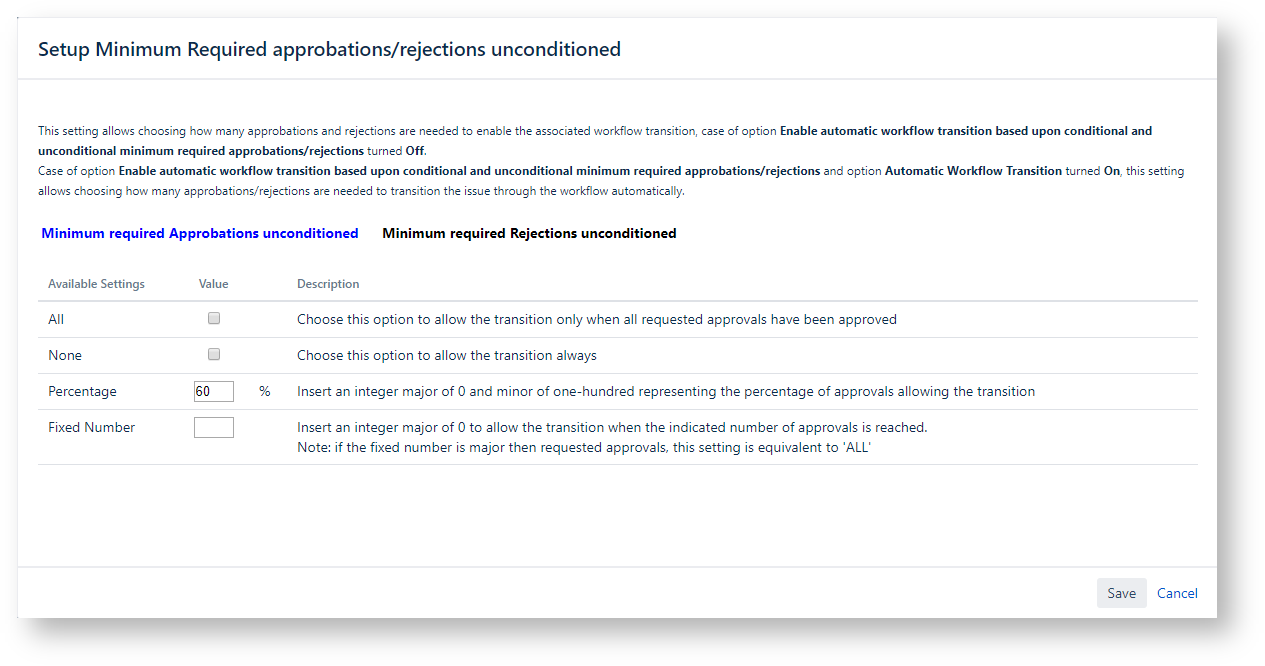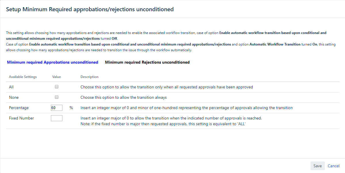 - Click on the Minimum required Approbations unconditioned tab and setup the Fixed Number to 60%