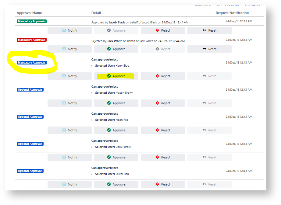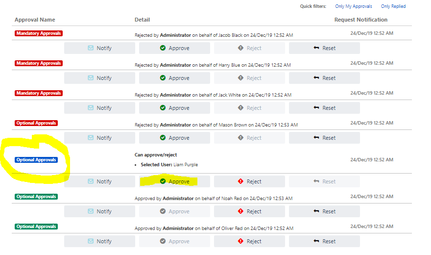 Drag and drop the Optional Approvals from the list of the Requested Approvals into the Optional Approvals box