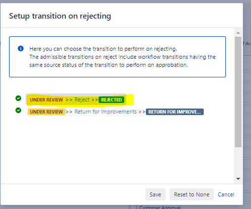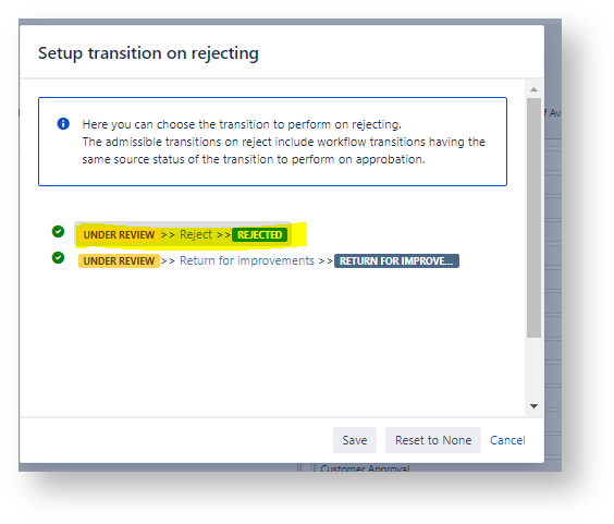 Select the Source Status→ Workflow transition → Destination Status that define the Issue's Workflow status where it is expected to require the approval, the Workflow transition to perform on rejection and the Destination Workflow status on rejection respectively.