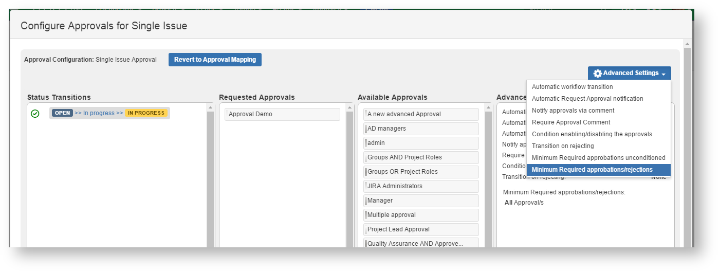 The panel of Minimum Required approbations/rejections and in the Advanced Setting summary will show as following.
