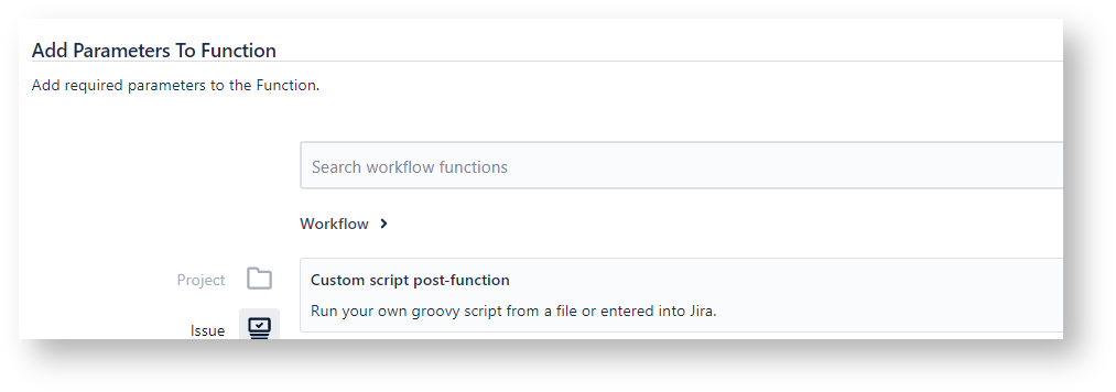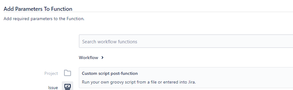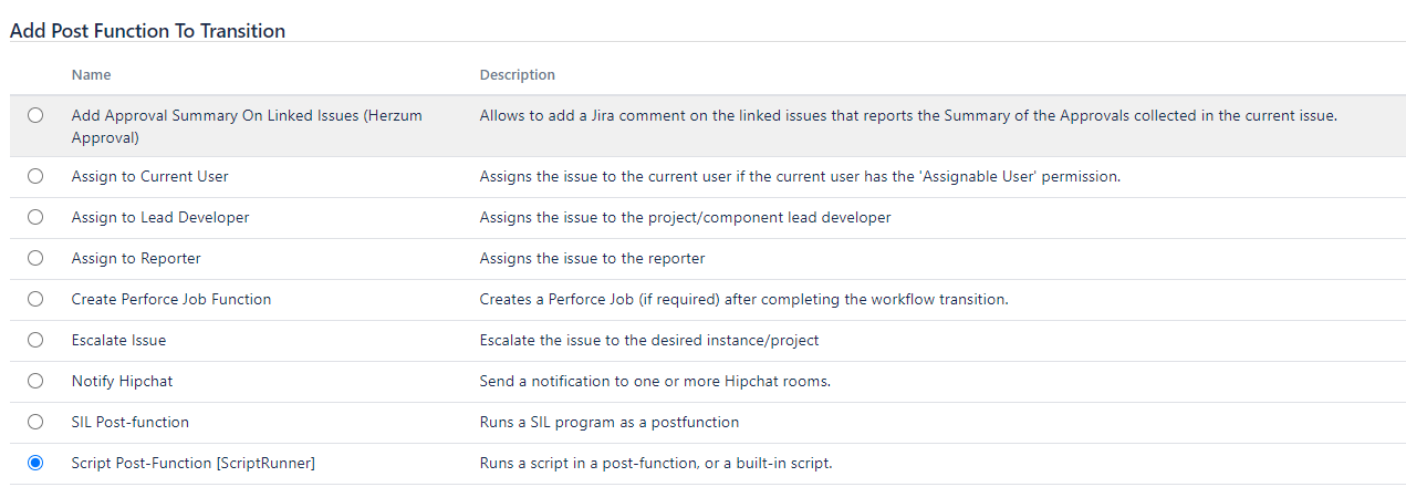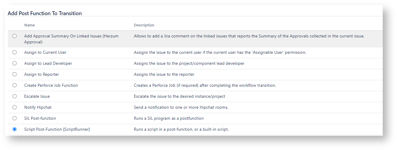 Add a Script Post-Function [ScriptRunner] and select Custom script post-function