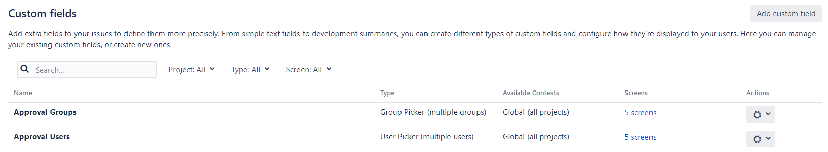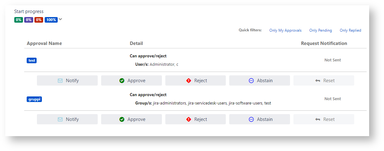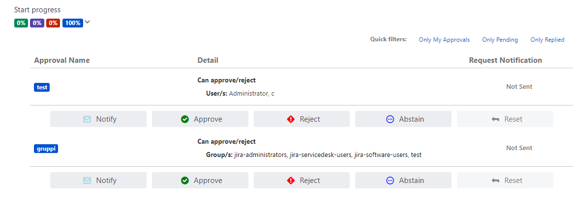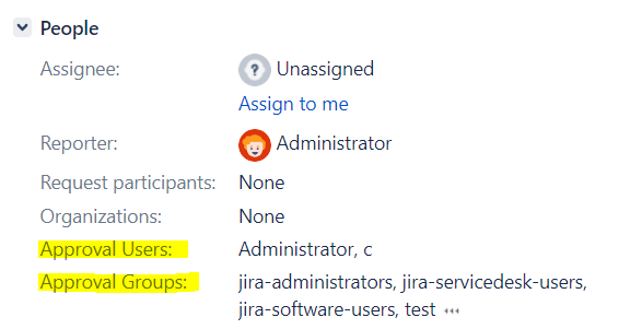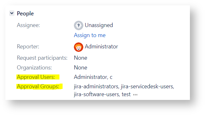 On transitioning the issue, the Approval Groups and Approval Users Custom fields are populated automatically with the Users and the Groups configured as requested Approvals: