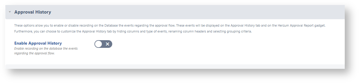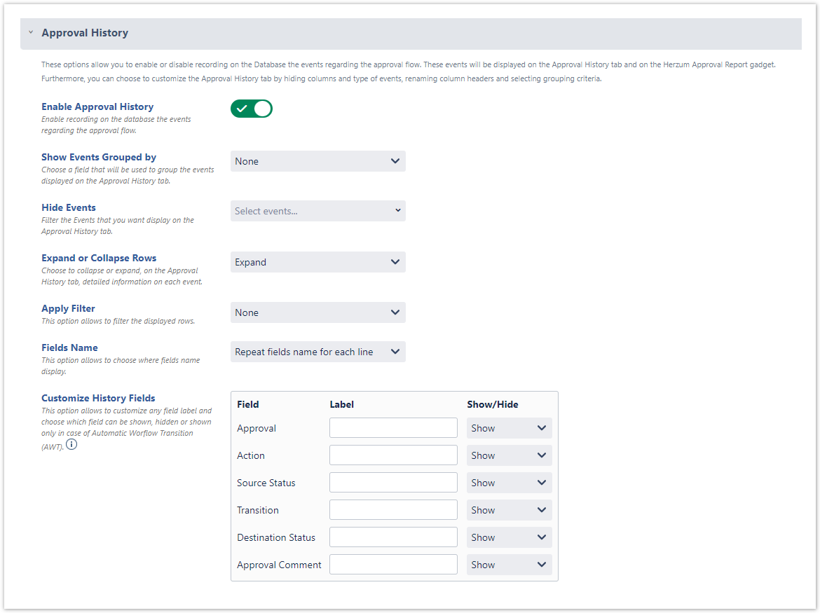 The Enable Approval History option allows you to persist, into the AO_D195E9_APPROVAL_HISTORY table, all historical data relating the Approvals.